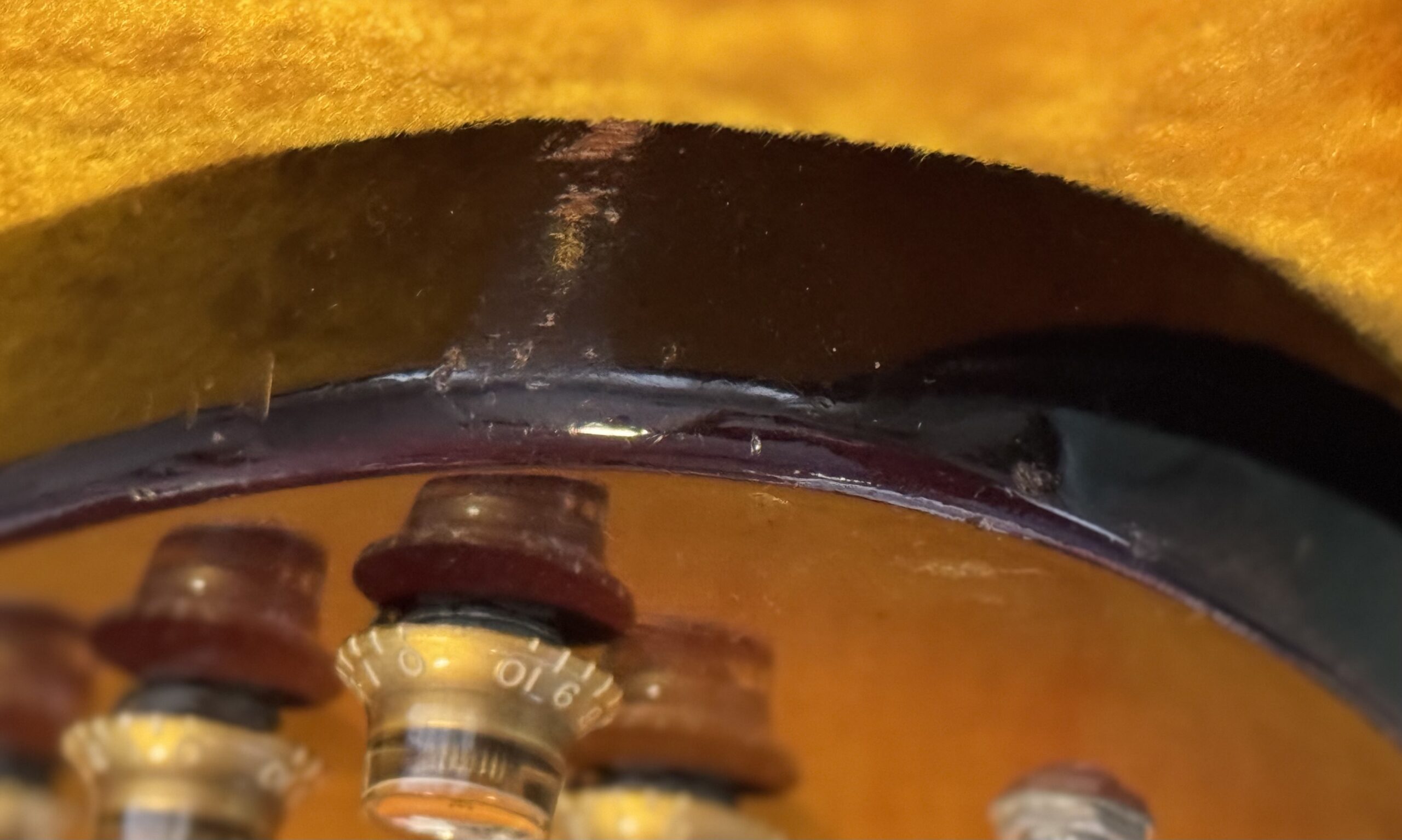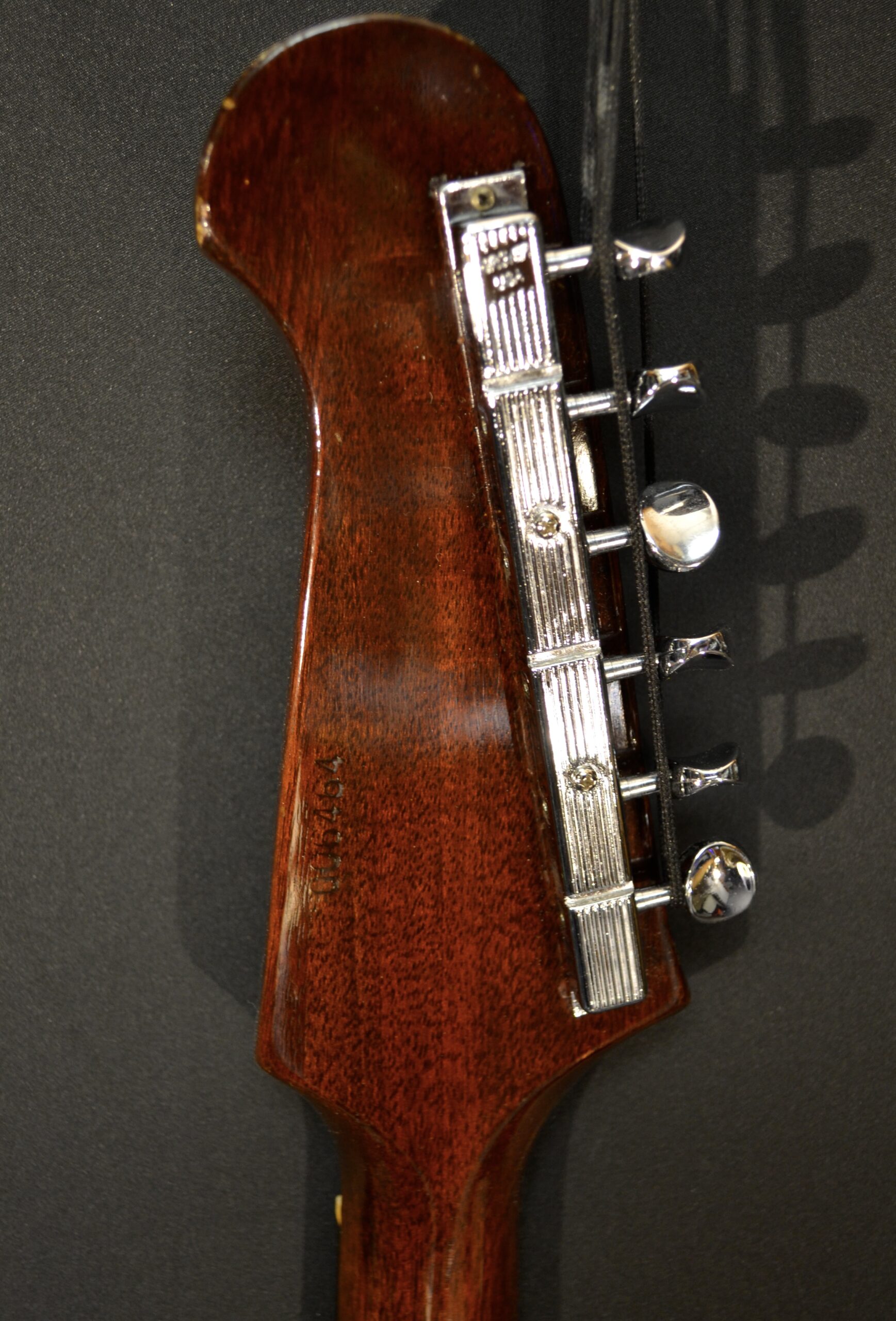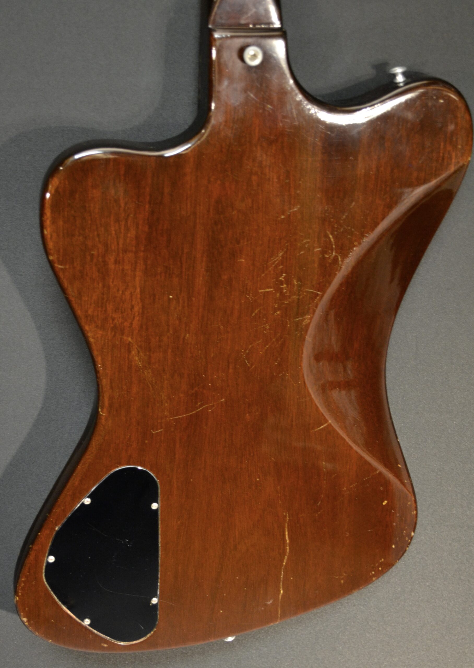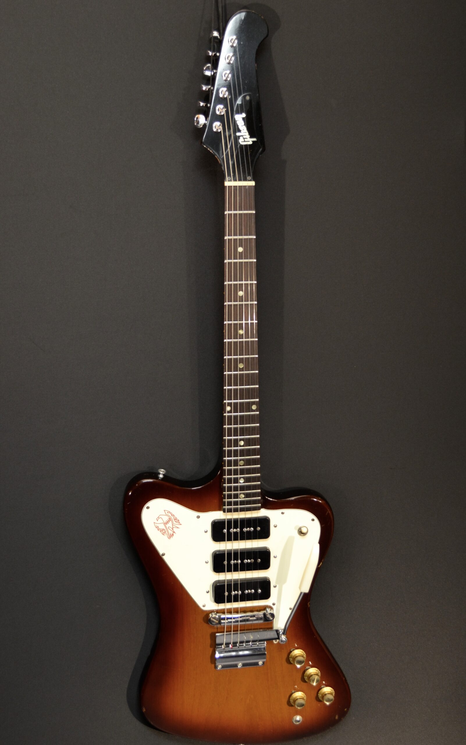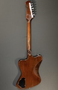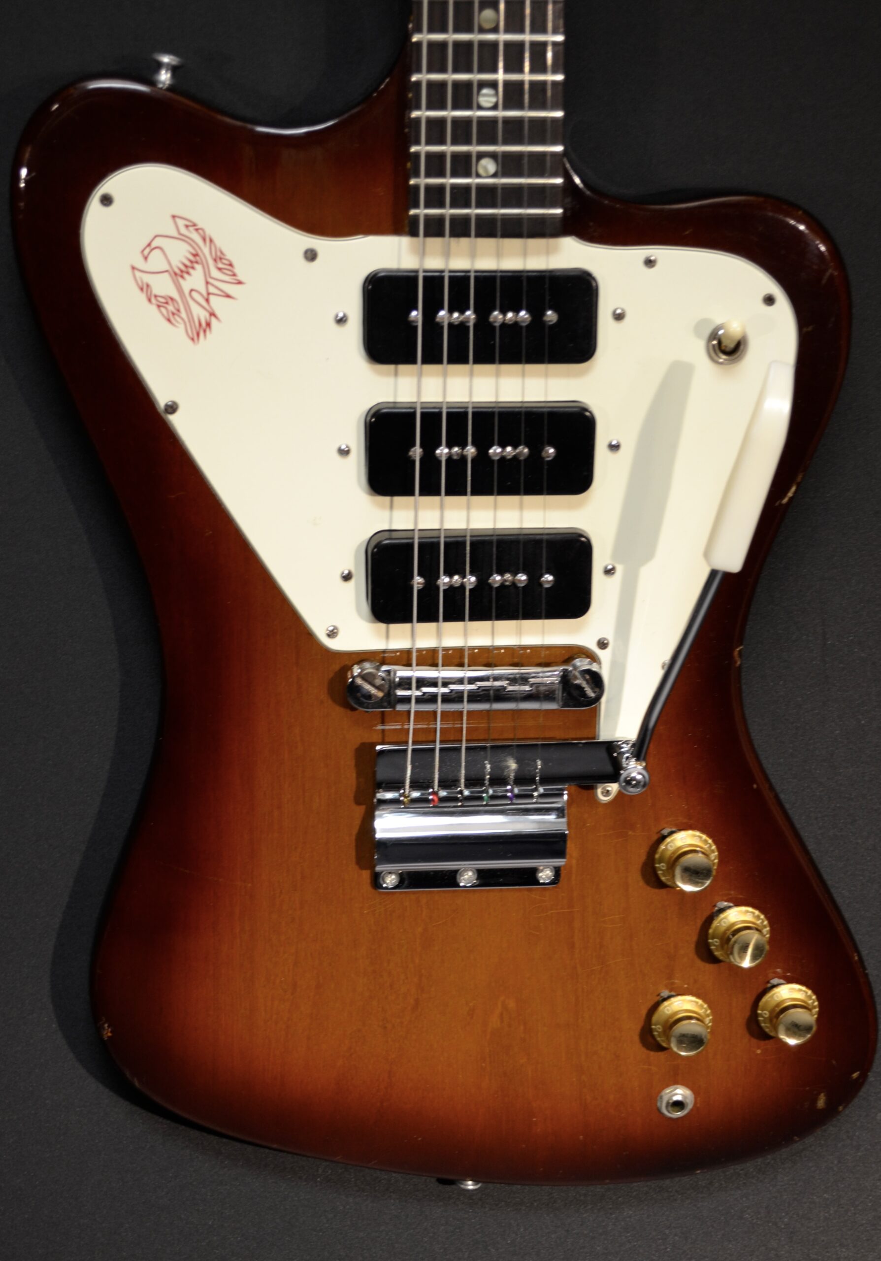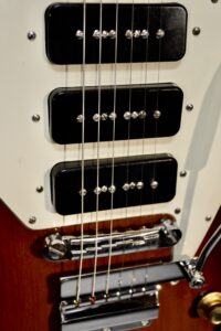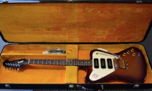 Non Reverse model in sunburst with three P-90s. All set up to play great. Some scuffs and dings from its early days but no breaks. Machine heads changed to Grover but the originals are in the case. New tremolo arm. Original case however one latch is broken and we installed a replacement leather handle. Overall in very nice shape.